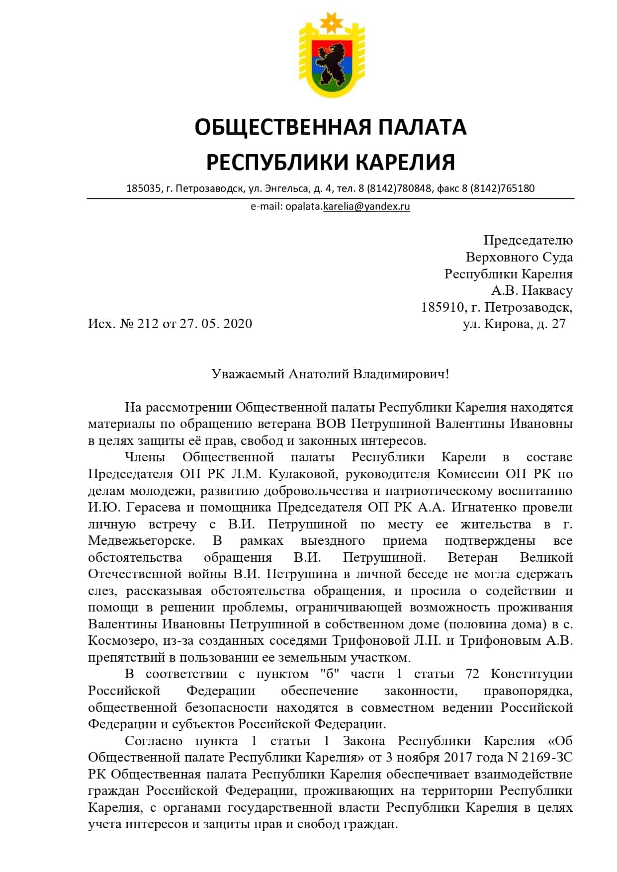Написать в Карельский Верховный Суд можно по адресу: 185910, г. Петрозаводск, ул. Кирова, д. 27.