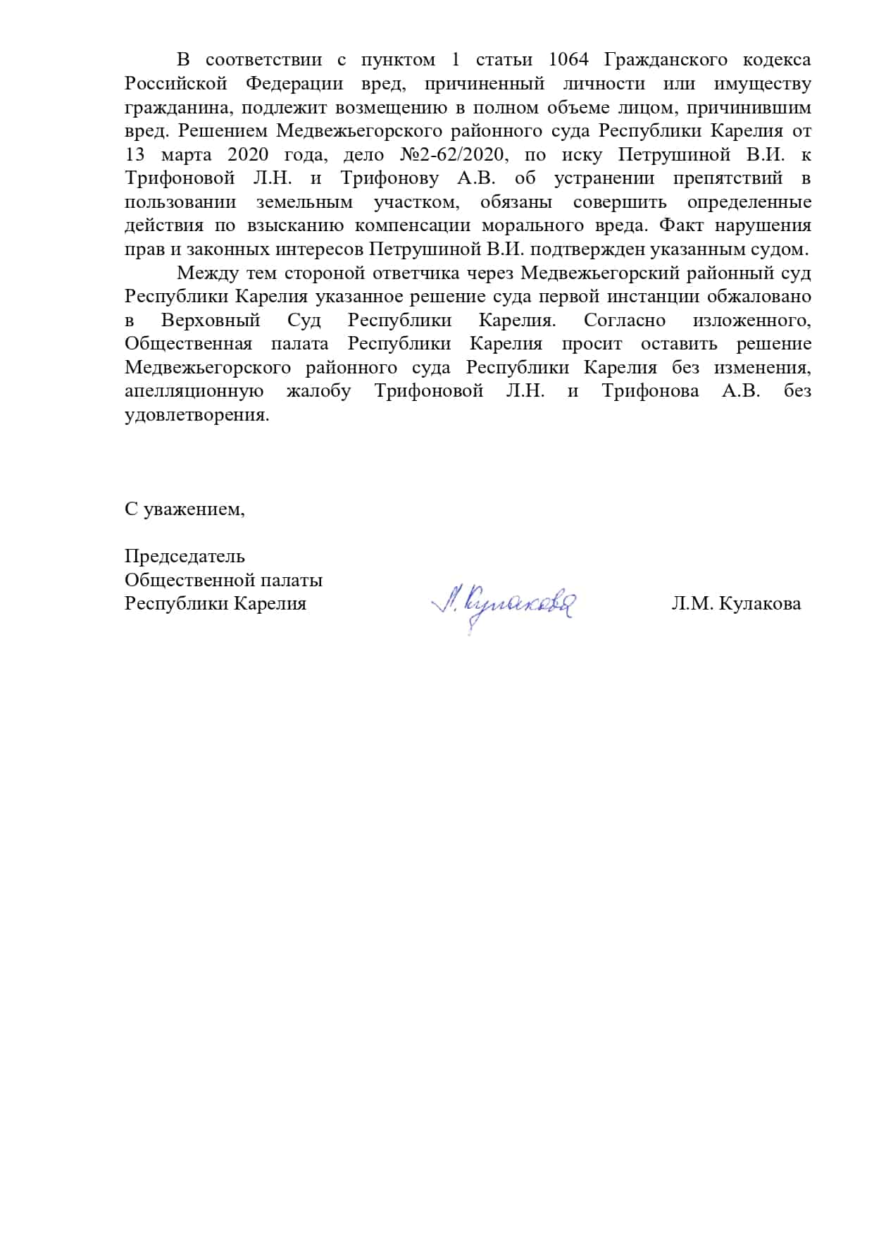 Пример обращения в Карельский Верховный Суд: