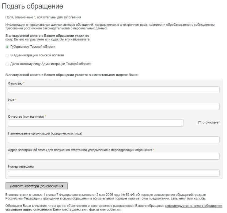 На официальном сайте подать обращение можно в форме электронного документа. Для этого следует воспользоваться ссылкой https://tomsk.gov.ru/appeal/front/new и указать всю необходимую информацию. При заполнении формы следует выбрать опцию «Губернатор Томской области»